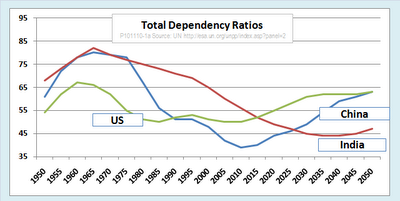 As the chart shows (click to enlarge), India is just entering its Goldilocks period while China, like the United States, is already leaving. Furthermore, The dip in the Indian chart is more gradual and longer-lasting than the corresponding dip for China. For the next several decades, China will be tacking into the wind while India still has its spinnaker up. Chinese economic growth will slow, while India's, assuming a supportive policy environment, will edge past it.